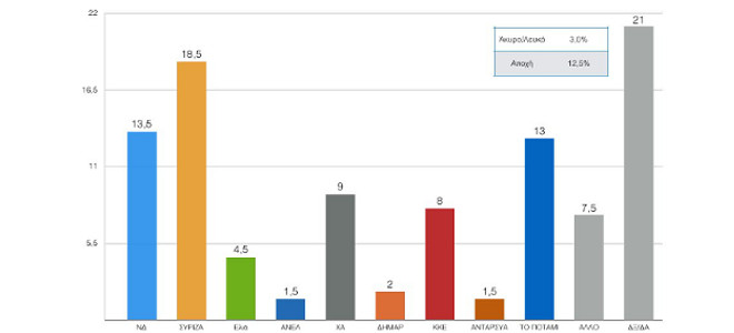 Η Ελιά συγκεντρώνει το 4,5%, οι Ανεξάρτητοι Ελληνες το 1,5%, η Χρυσή Αυγή το 9%, η ΔΗΜΑΡ 2%, το ΚΚΕ 8%, ΑΝΤΑΡΣΥΑ 1,5%, άλλο κόμμα 7,5% και η αδιευκρίνιστη ψήφος είναι στο 21%.